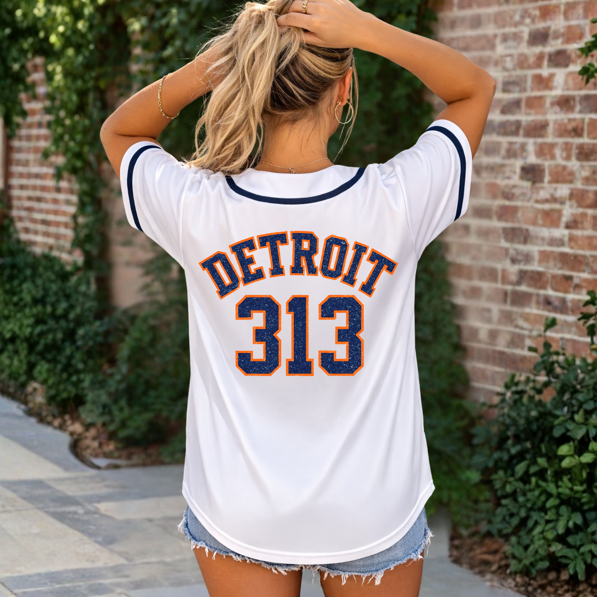 WE ARE SO EXCITED ABOUT THIS ONE! Game day just got an upgrade. This lightweight baseball jersey features our double layered sparkle Detroit 313 print for the perfect mix of sporty and statement.