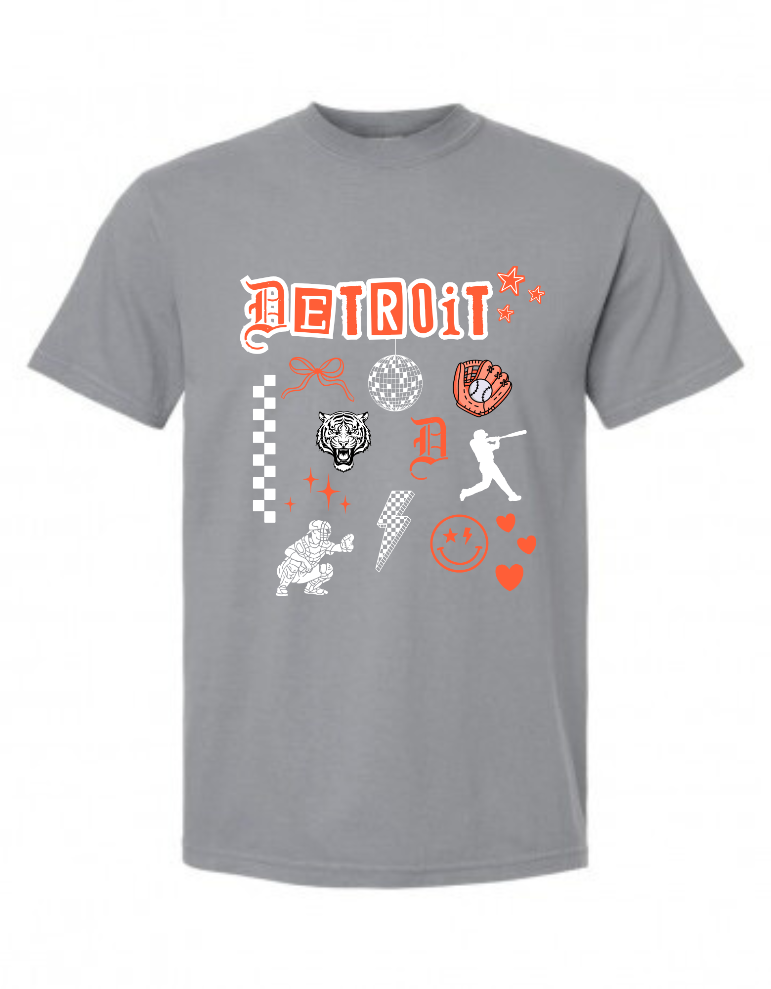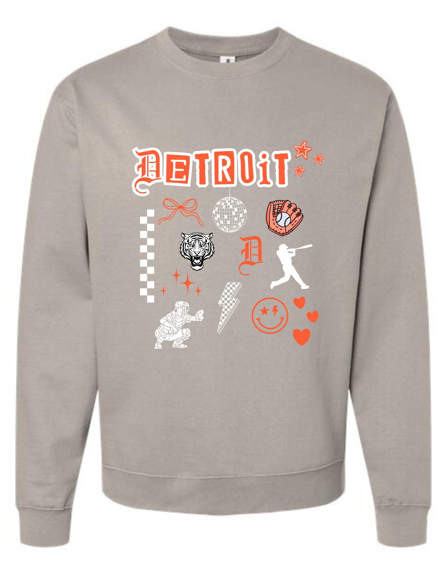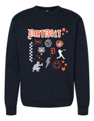Celebrate Detroit Tigers pride with this dynamic collage design featuring the iconic DETROIT logo surrounded by a vibrant cluster of sports-themed graphics and even a little sparkle heart detail! Available in two versatile styles—a soft unisex Comfort Colors tee or a cozy independent crewneck sweatshirt—this piece brings together everything that makes Tigers fandom special. Offered in sizes small through 3XL, it's the perfect addition for any fan's wardrobe, whether you're heading to the ballpark or showing your team spirit around town.