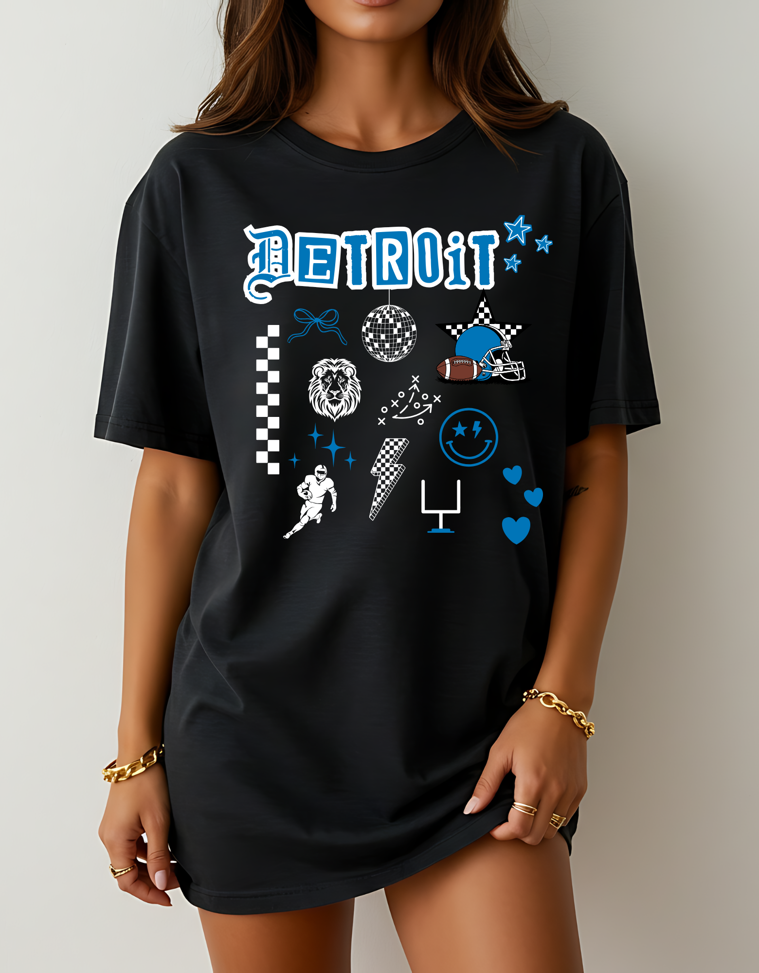 Celebrate Detroit Lions pride with this dynamic collage design featuring the iconic DETROIT logo surrounded by a vibrant cluster of sports-themed graphics and even a little sparkle heart detail! Available in two versatile styles—a soft unisex Comfort Colors tee or a cozy independent crewneck sweatshirt—this piece brings together everything that makes Lions fandom special. Offered in sizes small through 3XL, it's the perfect addition for any fan's wardrobe, whether you're heading to the stadium or showing your team spirit around town.