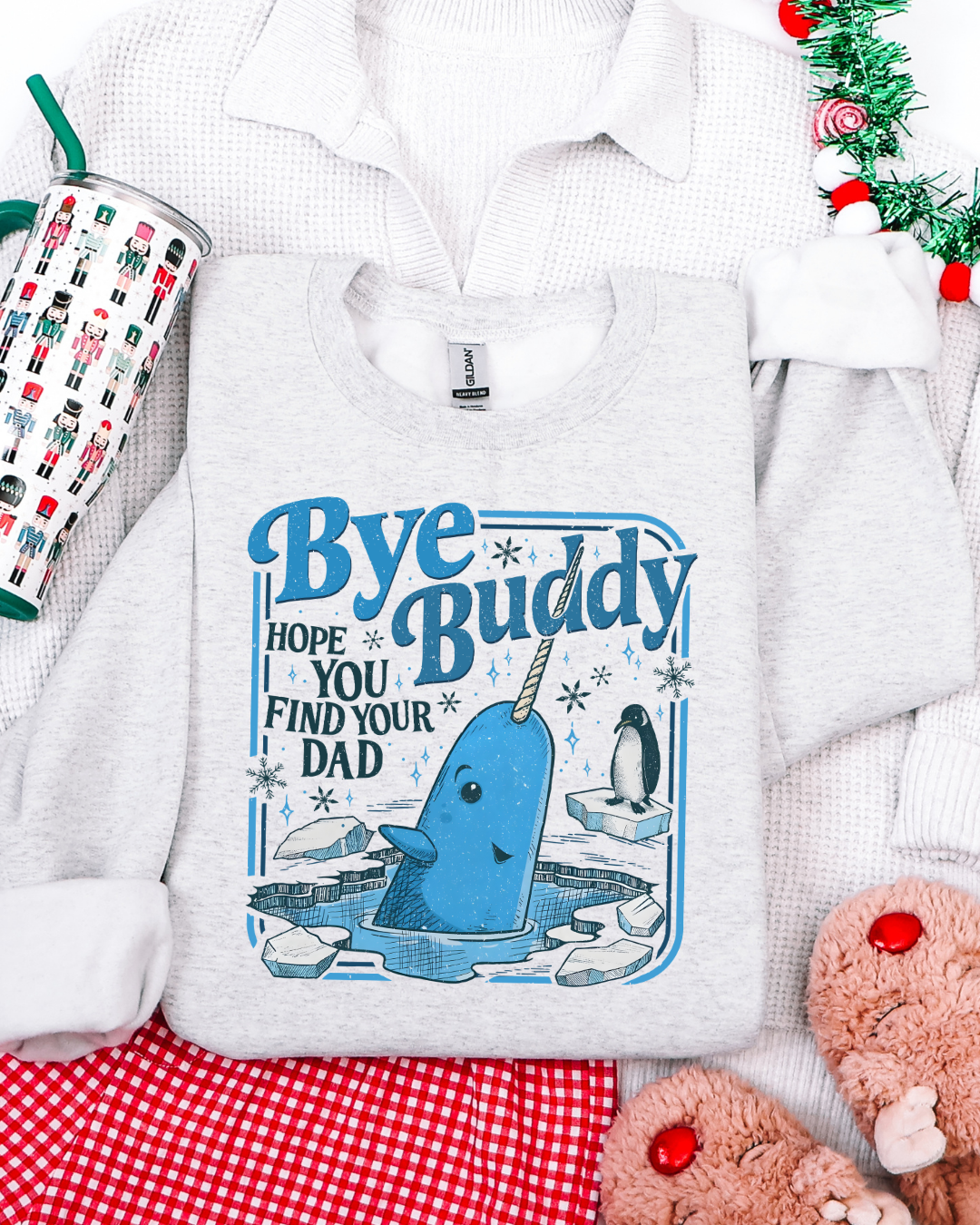 Calling all Elf lovers. This cozy crew brings the nostalgia, the laughs, and the perfect amount of holiday chaos. Our Bye Buddy design is printed on the softest fleece crewneck and gives major feel good Christmas movie vibes. It is the easiest throw on piece for tree decorating, cookie baking, holiday parties, or matching with your family.