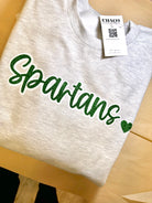 Celebrate your Michigan State pride with the Spartans Sparkle design, featuring a sparkling double layered green & white script font that catches the light beautifully. This statement piece is expertly crafted to stand out, available on crisp white, ash grey backgrounds for versatile styling. Perfect for those who want to showcase their love for Michigan State with a touch of elegant shimmer.