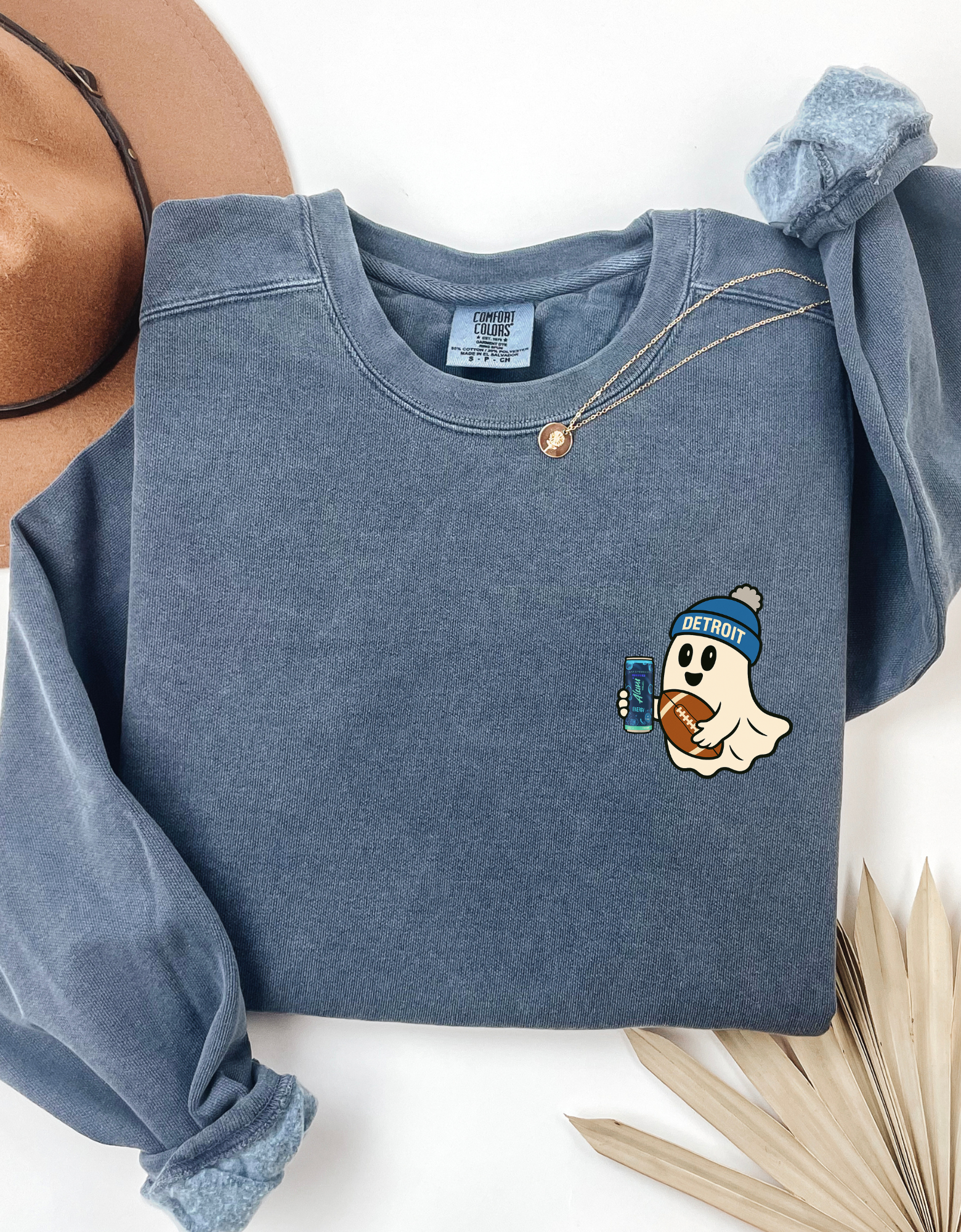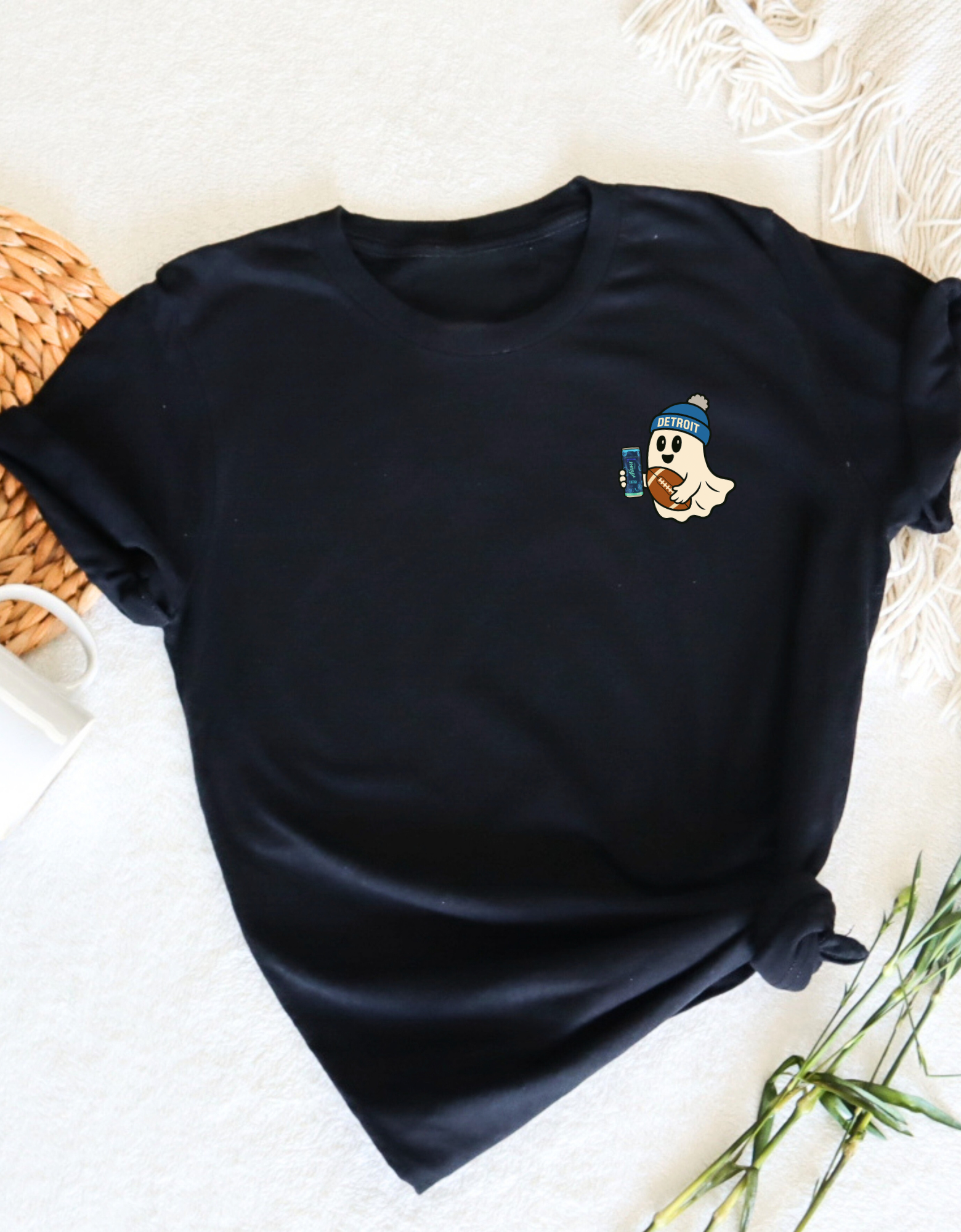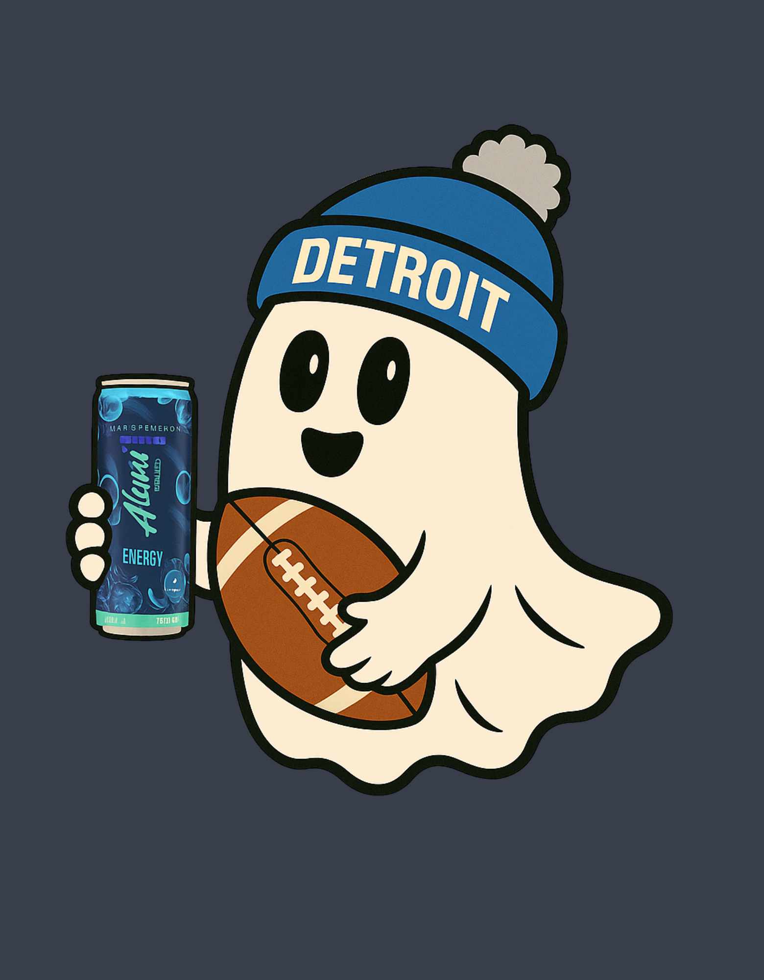 Meet your new game day ghost, repping Detroit, caffeine, and a whole lot of chaos. This cozy crewneck (and tee!) features our fan-favorite Detroit Ghostie graphic: a chill little ghost rocking his beanie, clutching a football, and sipping something cold.