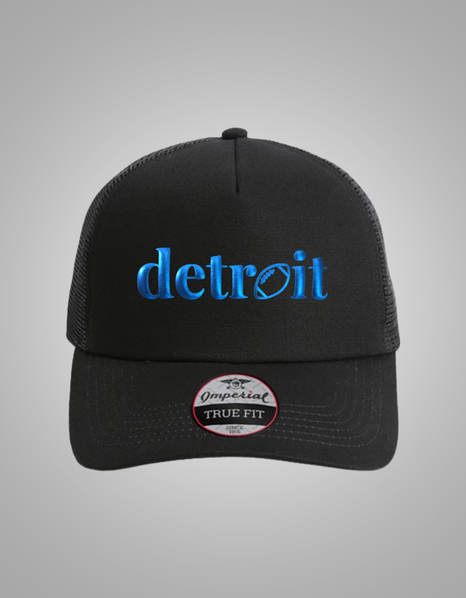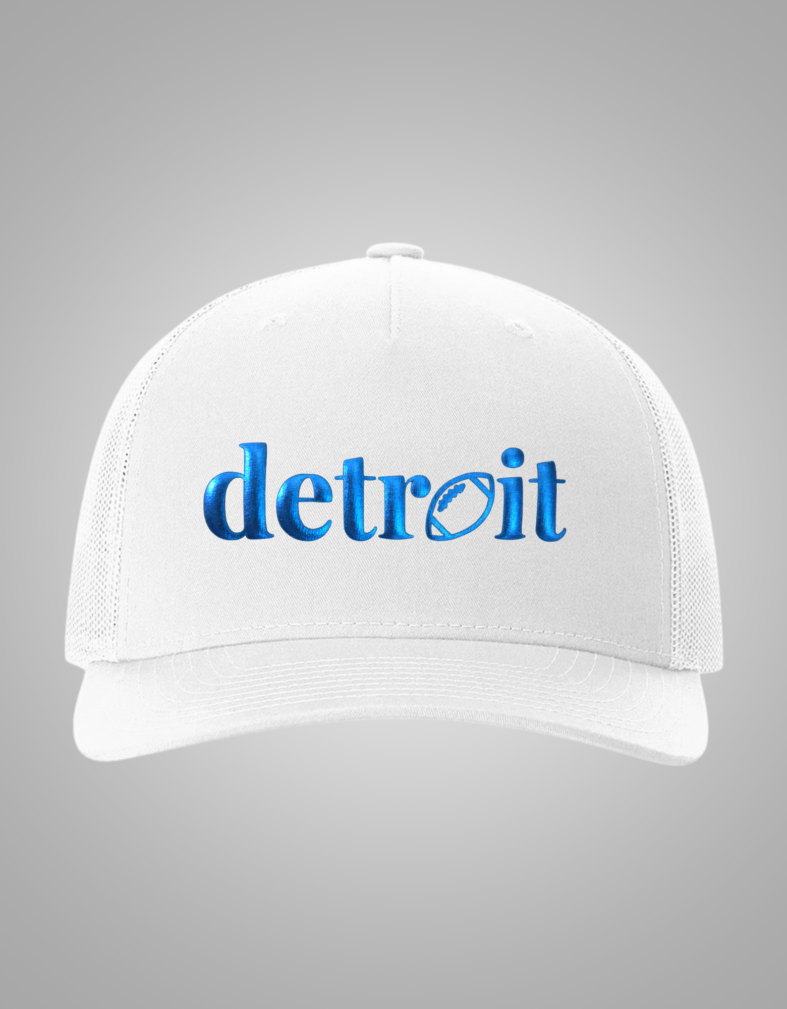 Bring the shine to game day with our Metallic Blue Puff Detroit Hat... where Chaos meets classic trucker style. Featuring bold puff-print lettering in a metallic blue finish, this hat was made to turn heads at tailgates, stadiums, and everywhere in between.