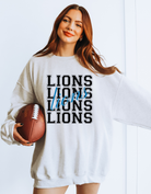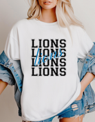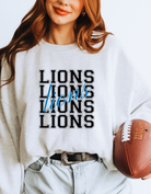 The Lions Repeat design features a bold block "Lions" repeated four times, overlaid with a graceful script "Lions" that adds a subtle feminine touch. Available in T-shirt, crewneck, and long sleeve options, this style refreshes traditional Lions apparel with a dynamic and balanced look for versatile wear.