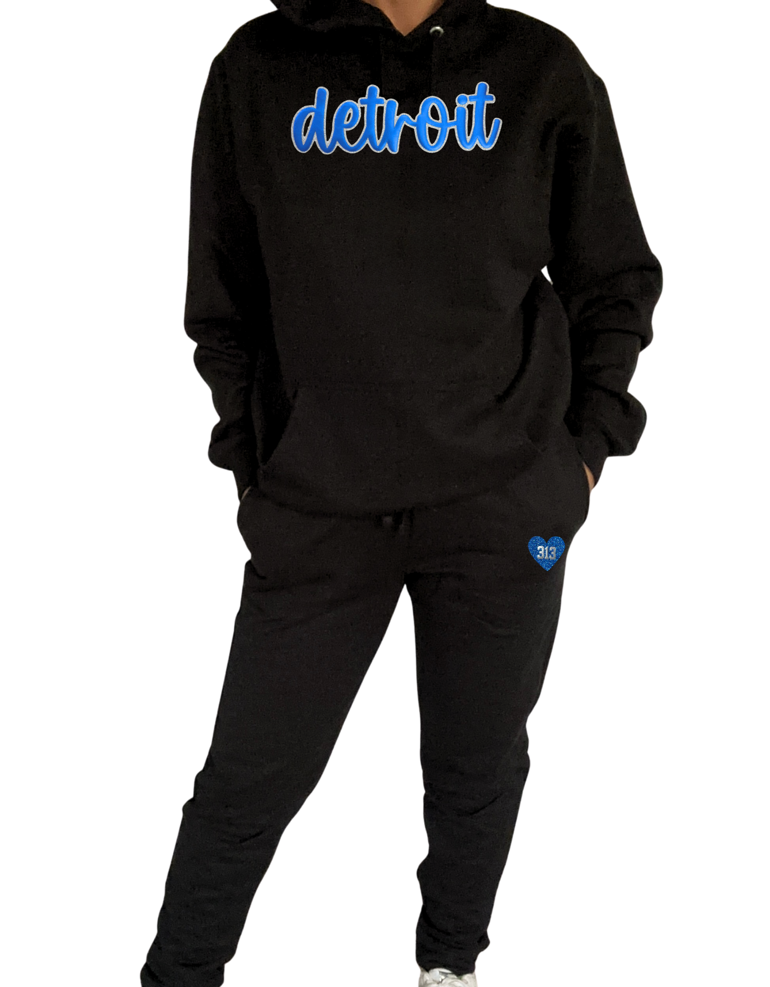 FEATURED ON FOX2: Our Brand New Minimalist Sparkle Matching Sweatsuit! This fits pretty true to size and is slightly oversized. This black hoodie and jogger set brings comfort, style, and hometown pride together in one perfect look. Featuring our silver sparkle behind blue metallic puff on the hoodie with a sparkle 313 heart on pants, this set has already been purchased by multiple local influencers and on even featured on Fox 2 News!