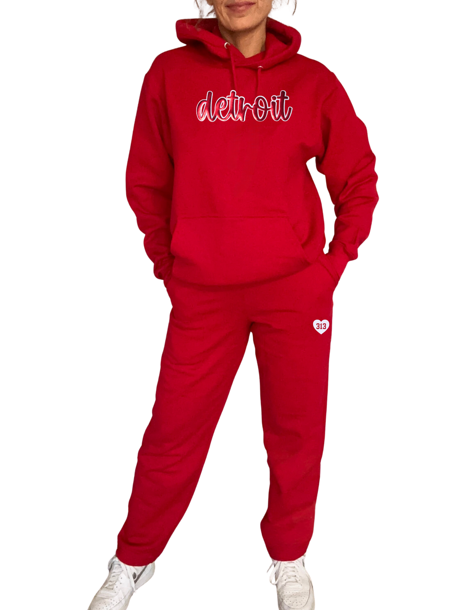 FEATURED ON FOX2: Our Brand New Minimalist Sparkle Matching Sweatsuit! This fits pretty true to size and is slightly oversized. This red hoodie and jogger set brings comfort, style, and hometown pride together in one perfect look. Featuring our sparkle 313 heart logo, this set has already been purchased by multiple local influencers and on even featured on Fox 2 News!