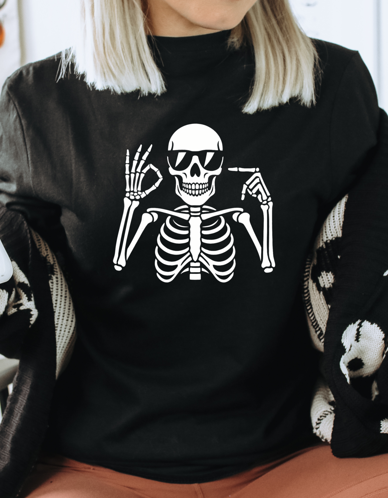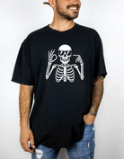 Keep it cool (and creepy) with our Chill Skeleton tee 💀🕶️. Featuring a skeleton rocking shades and flashing the perfect hand signs, this black unisex shirt is equal parts spooky and stylish.