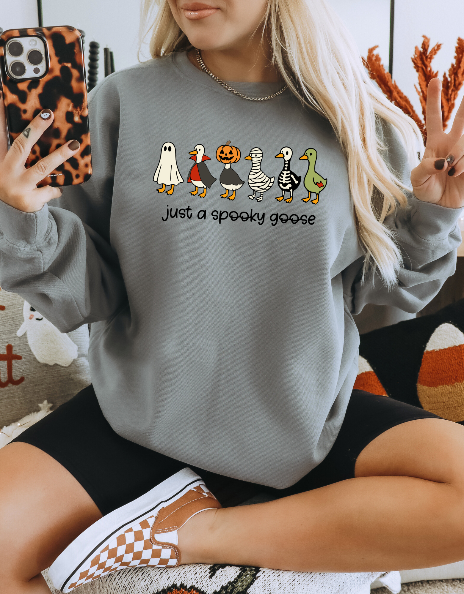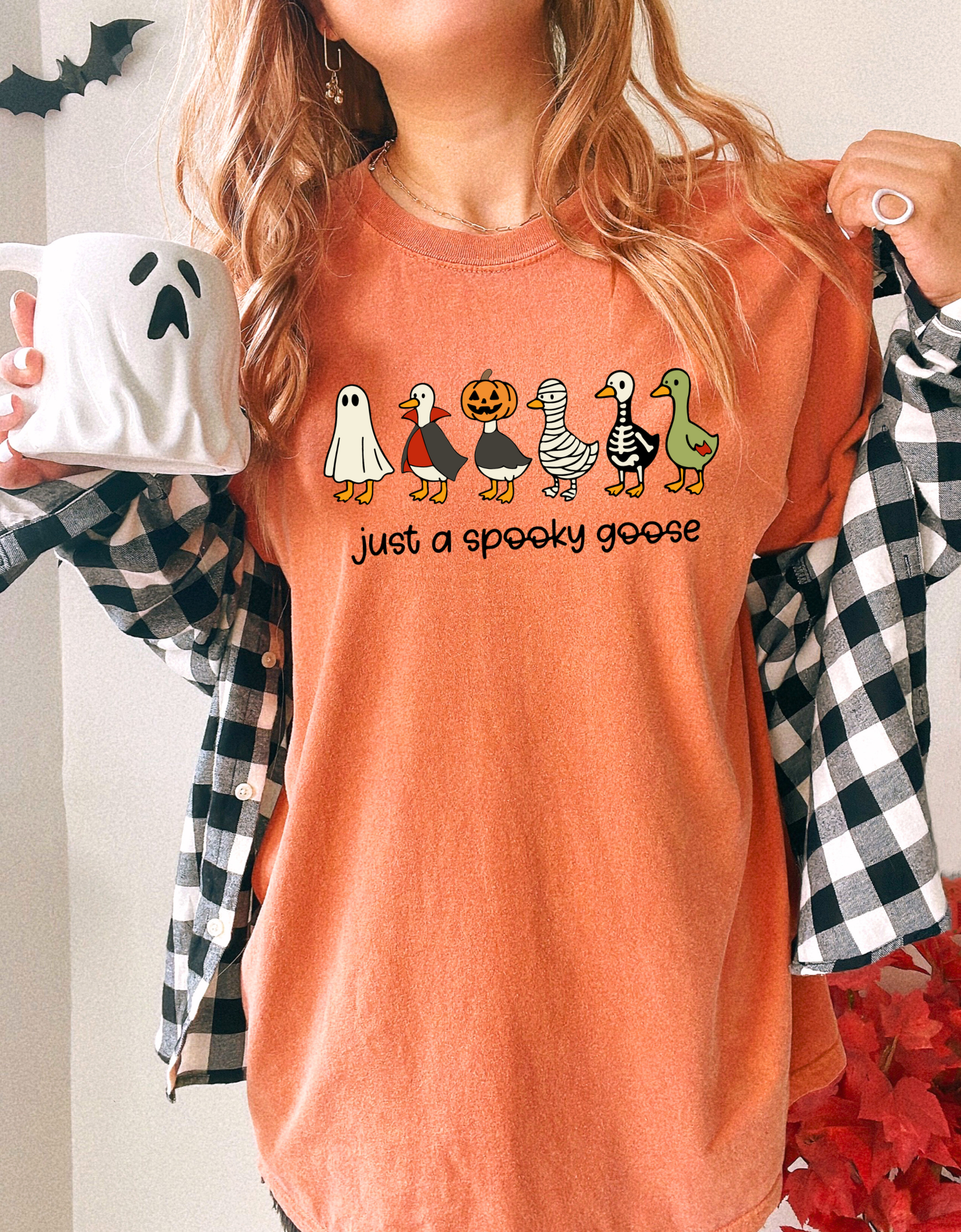 Spice up spooky season with our Just a Spooky Goose tee 🦆👻. Featuring geese in their best Halloween costumes, this soft and comfy shirt is perfect for fall vibes, pumpkin carving, or trick-or-treat fun.