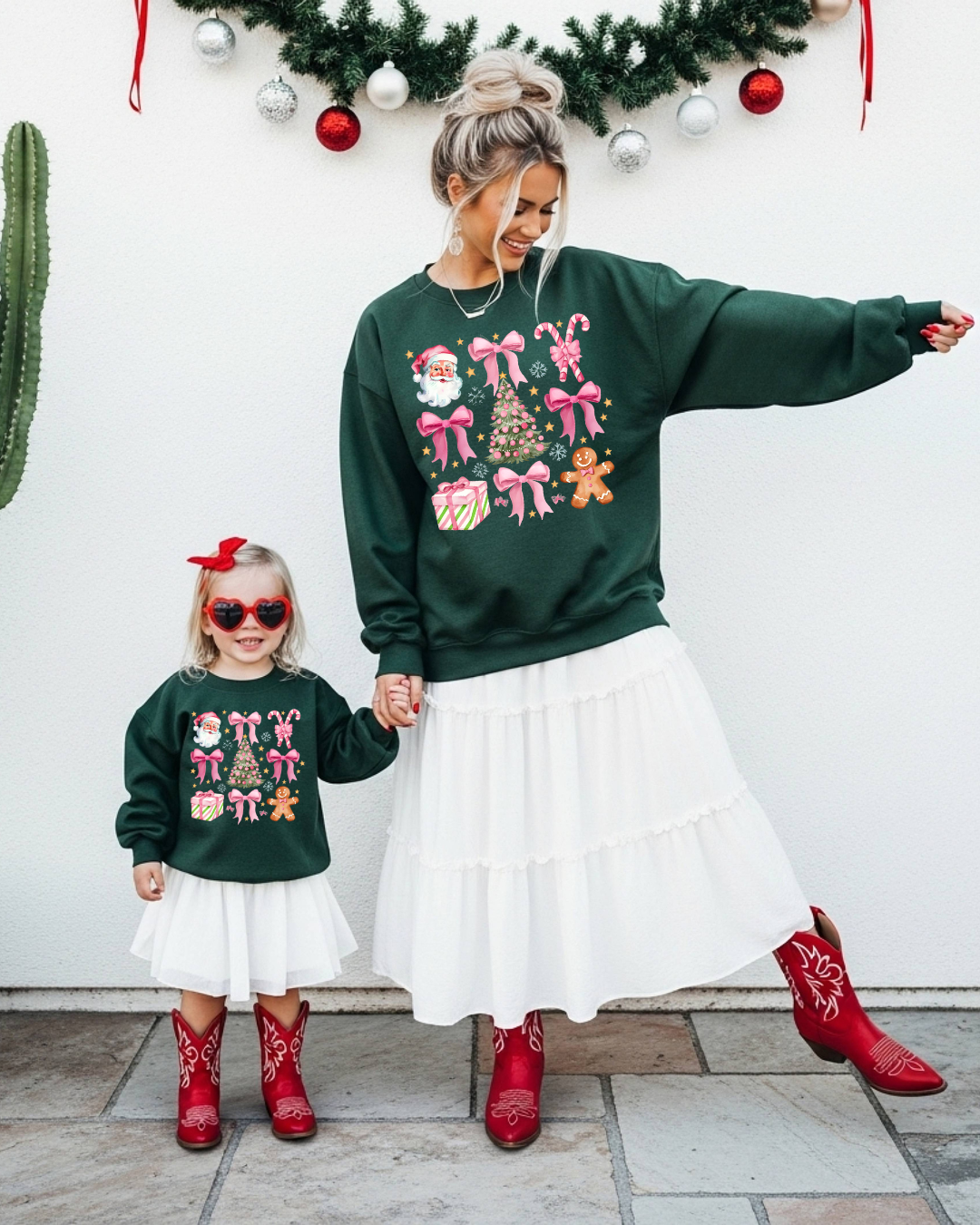 Soft, sweet, and full of Christmas magic, this pink holiday sweatshirt brings all the cozy vibes. Featuring pastel bows, candy canes, Santa, a gingerbread cutie, and the prettiest little Christmas tree, it’s the perfect mix of classic holiday charm and soft girl aesthetic.