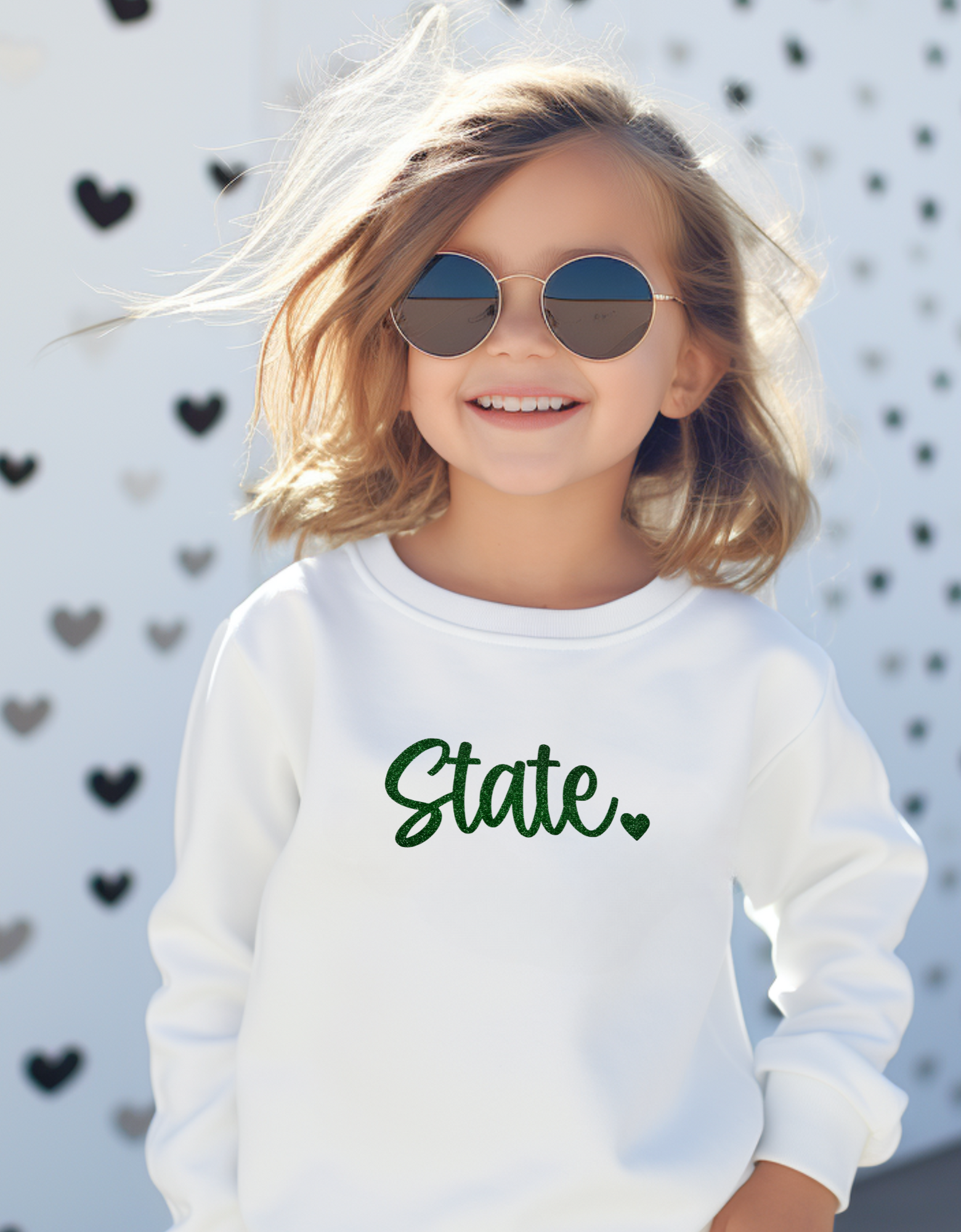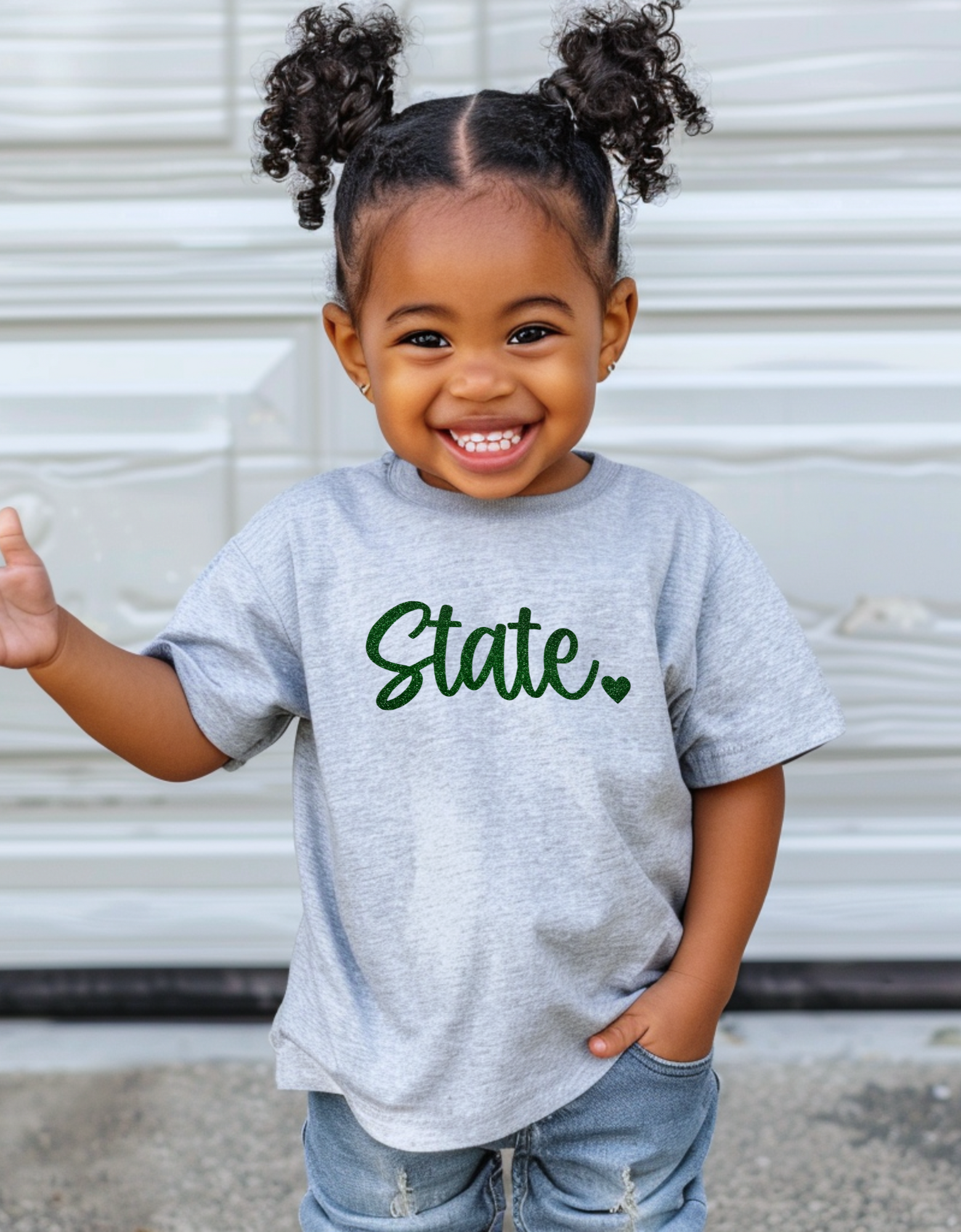 Celebrate gameday in style with the State Script Sparkle - Kids shirt, available in both sparkling and non-sparkling green options. Designed specifically for young Michigan State fans, this shirt offers comfortable wear for kids while showcasing school spirit. Perfect for families who want their little ones to join in the excitement of college events, it’s an excellent choice for supporting the Spartans with a touch of personalized flair.