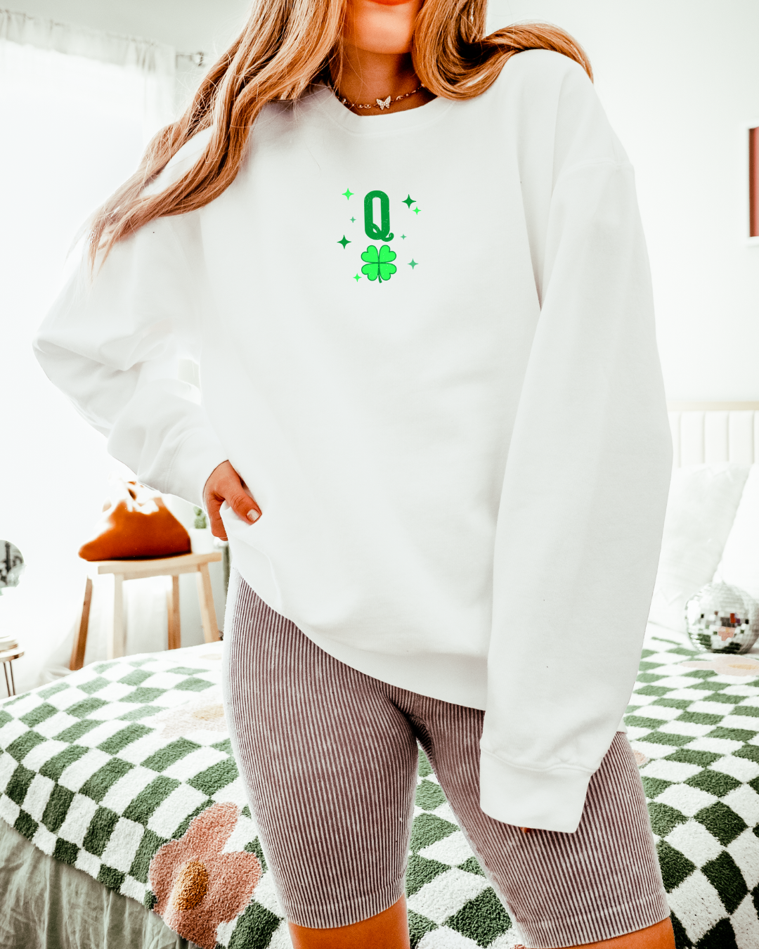 Embrace your Irish heritage with this minimalist Queen of Hearts design, reimagined with subtle Celtic flair. Featuring a delicate lowercase "q" adorned with star accents, this piece celebrates understated elegance for those who appreciate refined style with cultural significance. Choose between a cropped baby tee in crisp white with contrasting green raglan cap sleeves for a modern, fitted silhouette, or opt for the classic crewneck sweatshirt in pure white for versatile everyday wear. Both styles deliver quality construction and thoughtful design details that make a quiet statement. Perfect for the holidays or year-round wear, this collection merges minimalist aesthetics with Irish-inspired artistry.