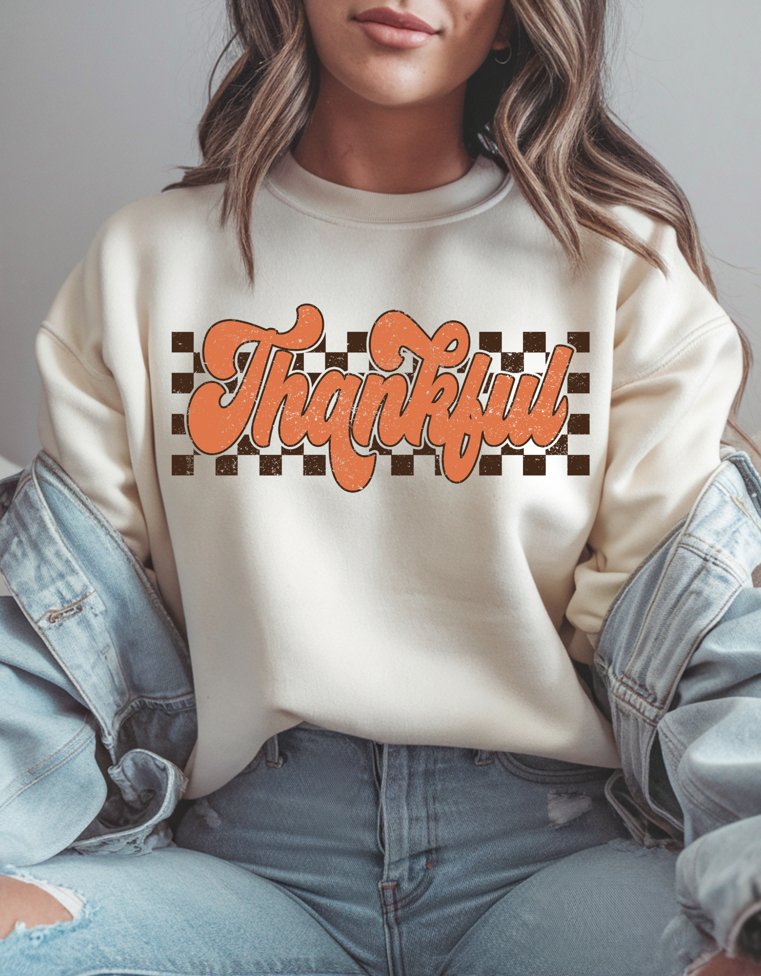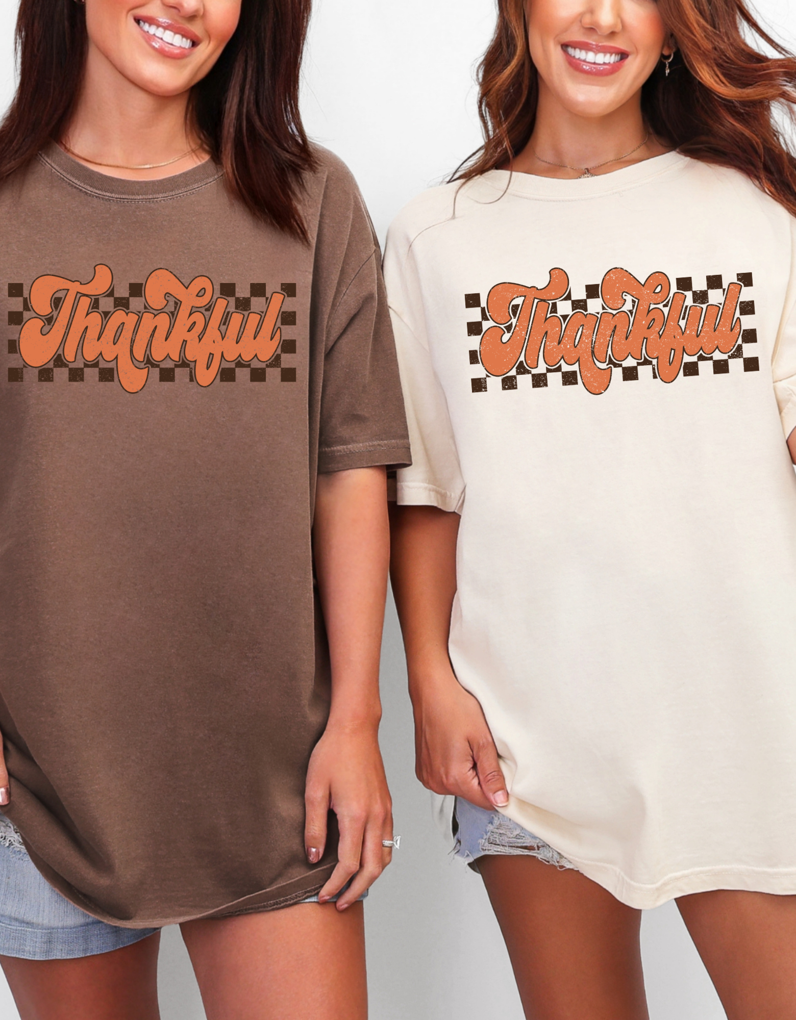 Cozy, cute, and made for pumpkin-spice season: Our Thankful checkerboard design brings the perfect retro vibe to your fall wardrobe. With a bold vintage-style font and checkered background, this tee is your new go-to for Thanksgiving gatherings, coffee runs, and cozy weekends at home.