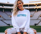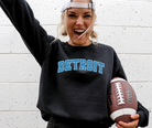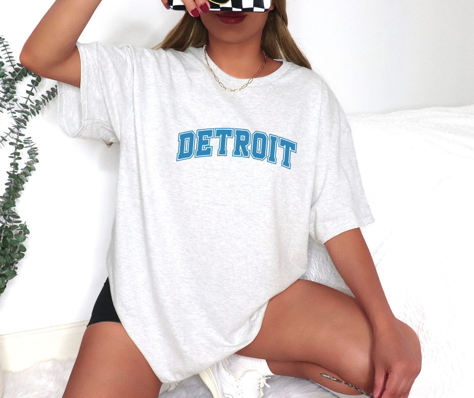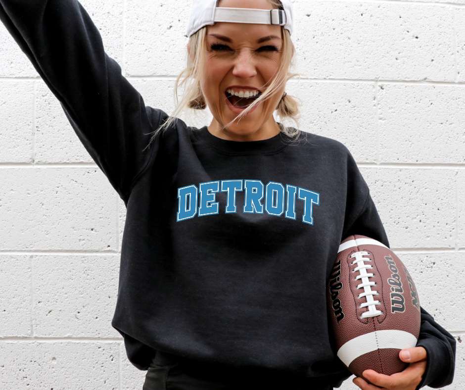Show your Detroit pride with the Arch Block Detroit Football apparel, featuring a bold collegiate-style "DETROIT" in a curved arch with a blue lion inside and crisp white outline. Available as a t-shirt, crewneck sweatshirt, long sleeve, or hoodie, this collection offers versatile comfort and classic style. For a relaxed, oversized fit, simply size up one to two sizes. Perfect for fans seeking a striking blend of sporty design and everyday wearability.