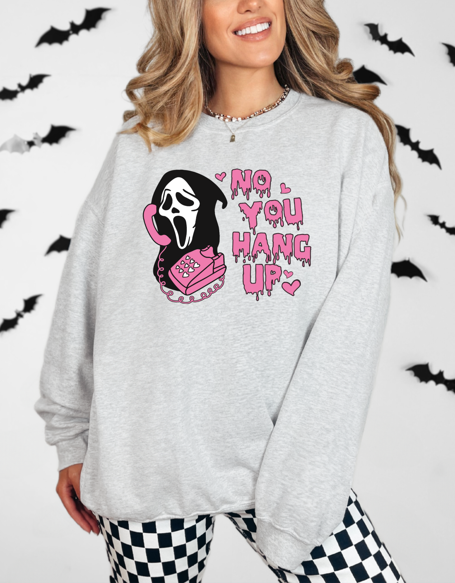 Calling all horror movie fans! Celebrate your love for the iconic film Scream with our “No, You Hang Up” design featuring a cute, girly twist on Ghostface. This playful shirt captures the infamous line in a fun and stylish way, making it a must-have for any fan of the franchise.