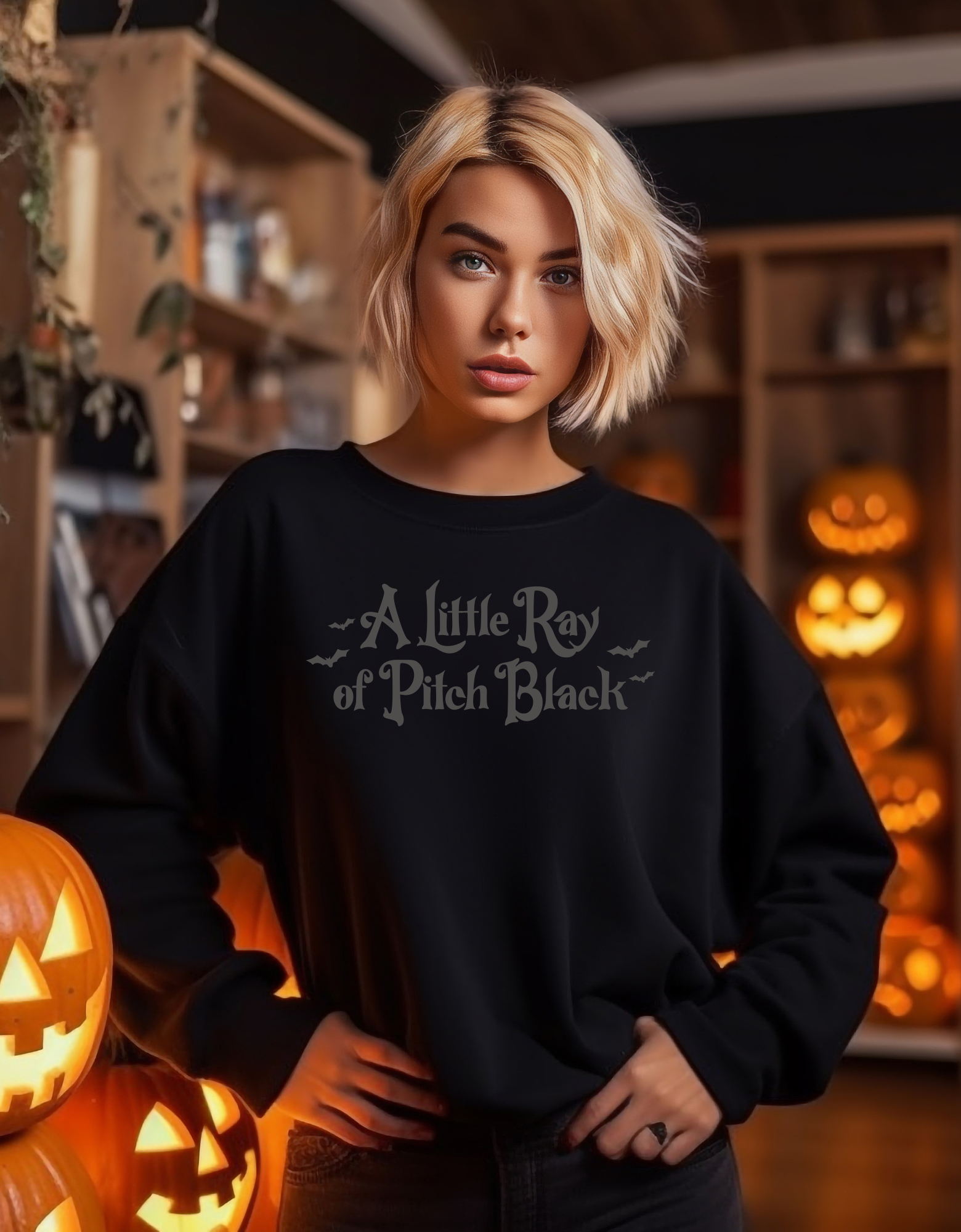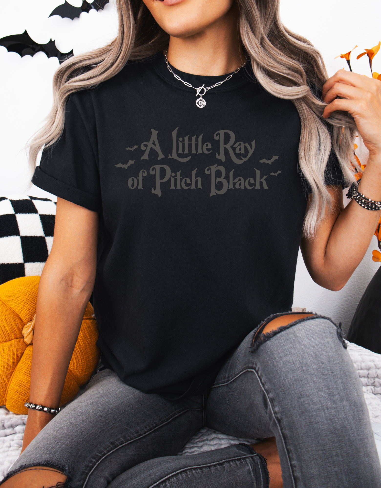 Bring the dark vibes with our A Little Ray of Pitch Black tee ππ€. Featuring a bold puff print design on a classic black shirt, this piece is the ultimate mix of spooky and sassy. The raised puff print adds texture and edge, making it a standout in your Halloween (or everyday) lineup.