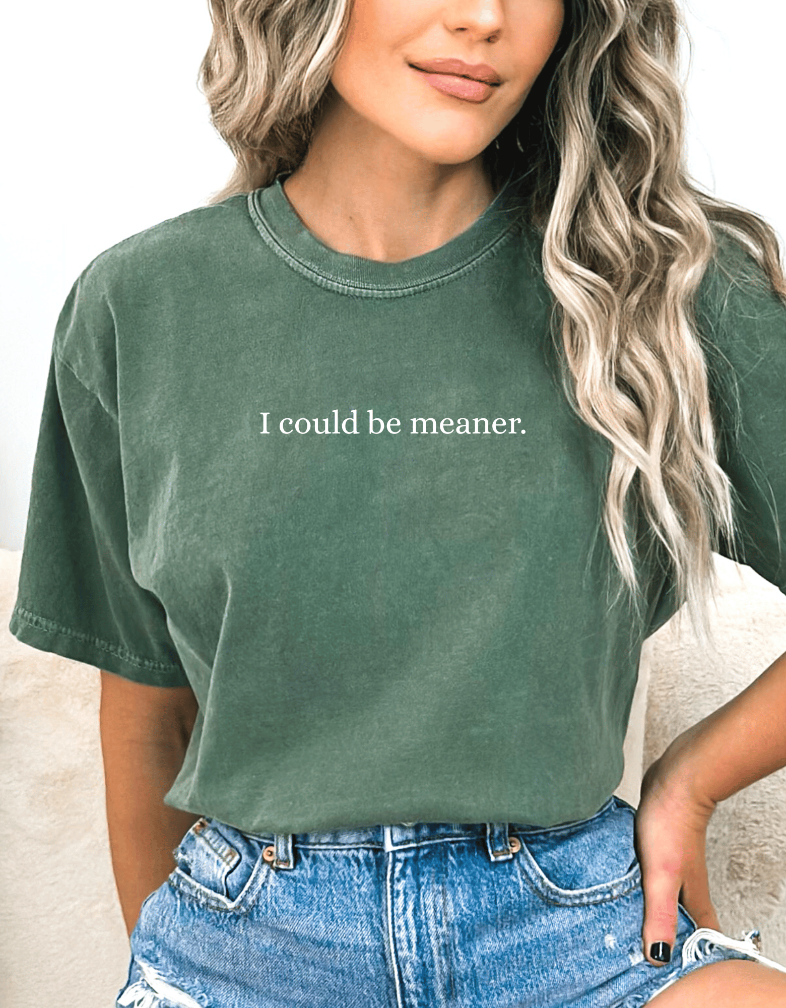 A little sass never hurt anyone… but it could’ve. 😏 Our “I Could Be Meaner” tee is for those who keep it classy and unbothered. Printed on ultra-soft Comfort Colors shirts in pepper, green, or black – this shirt gives off effortless edge with a lived-in feel you’ll never want to take off.