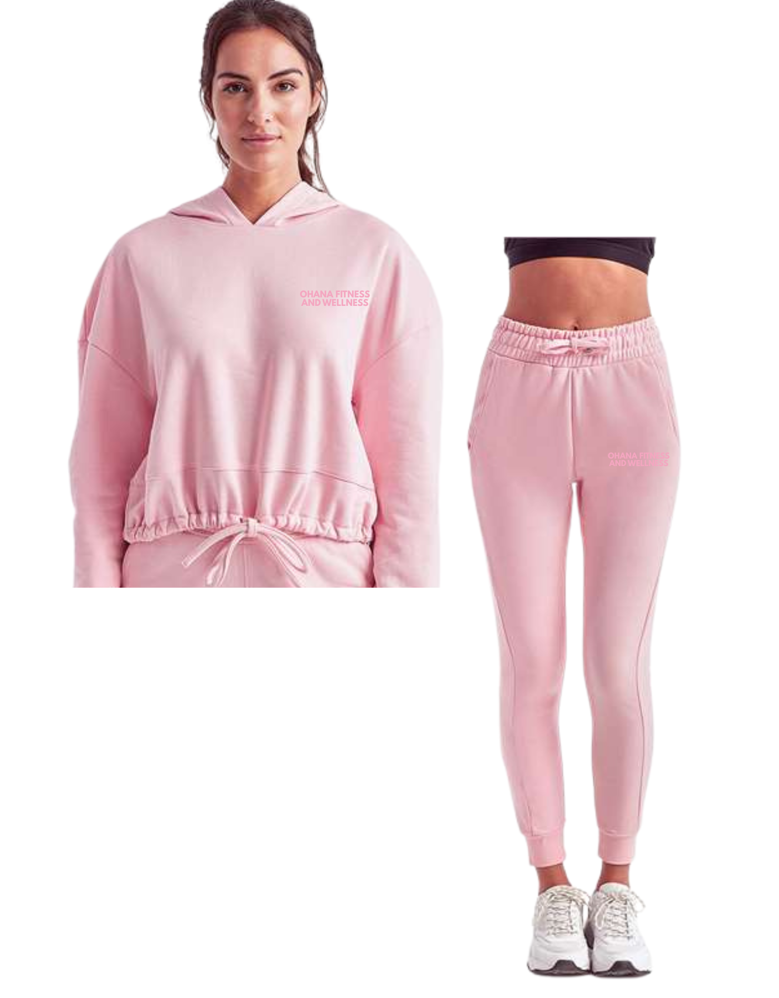 Minimalist Ohana Fitness and Wellness you can choose between shorts or Joggers in the set and your color either in pink or lilac! A small pocket logo on the chest of the hoodie and then on the shorts too makes for a cute statement set from your favorite fitness studio!