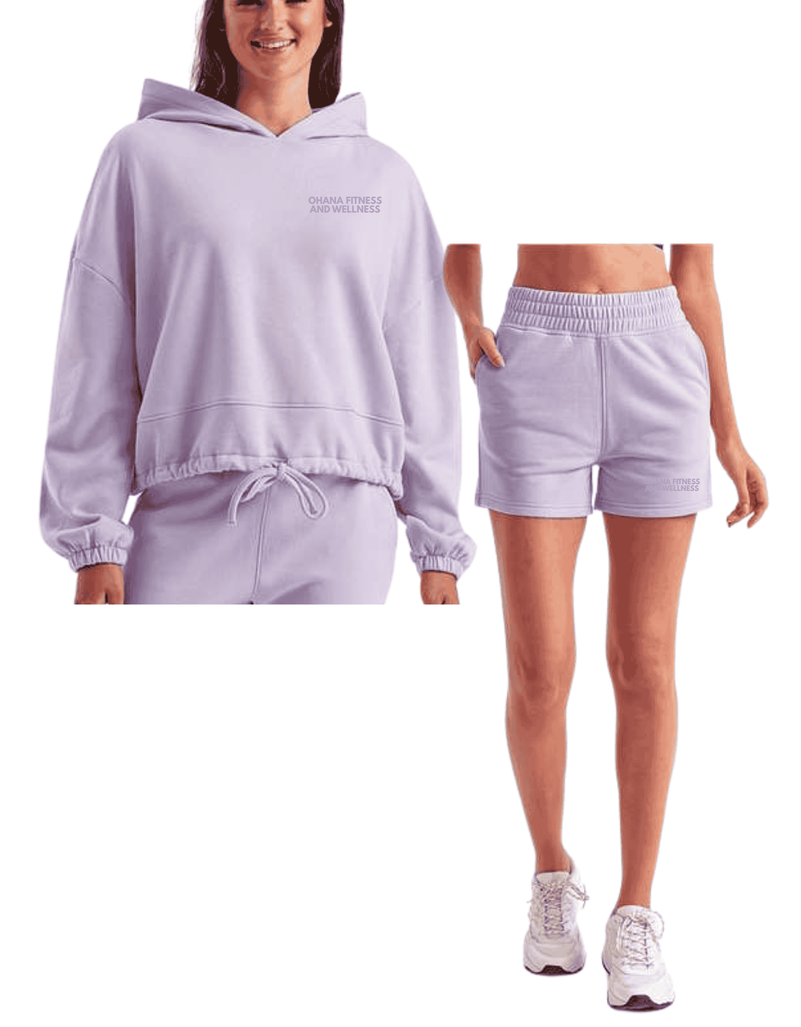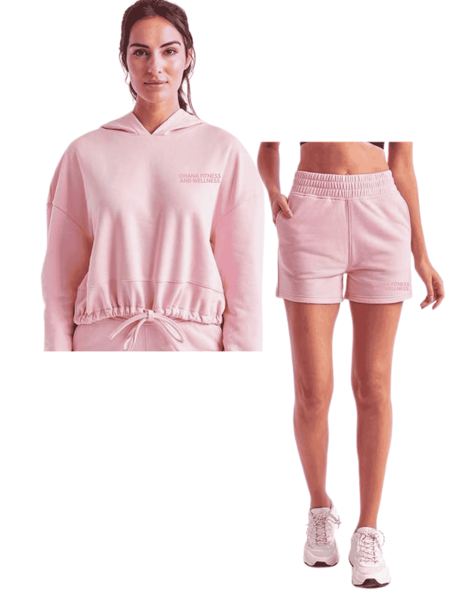 Minimalist Ohana Fitness and Wellness you can choose between shorts or Joggers in the set and your color either in pink or lilac! A small pocket logo on the chest of the hoodie and then on the shorts too makes for a cute statement set from your favorite fitness studio!