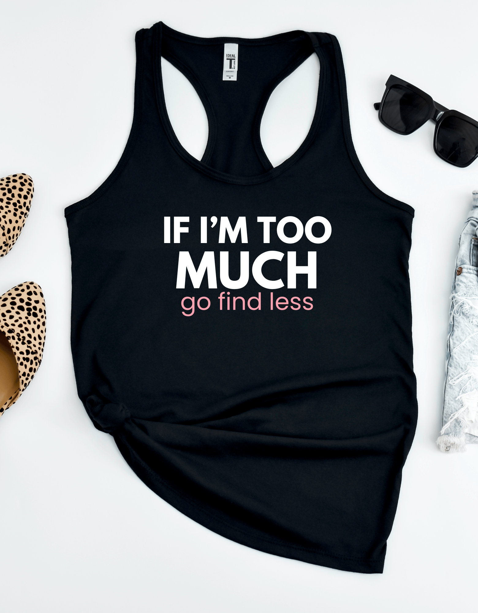 Our if I'm Too Much, Go Find Less tank top is made for the bold, confident women who embrace their strength and aren't afraid to show it! This racerback tank features a flattering women’s fit and is crafted from high-quality, breathable fabric that feels soft against the skin, making it perfect for your workouts or everyday wear.